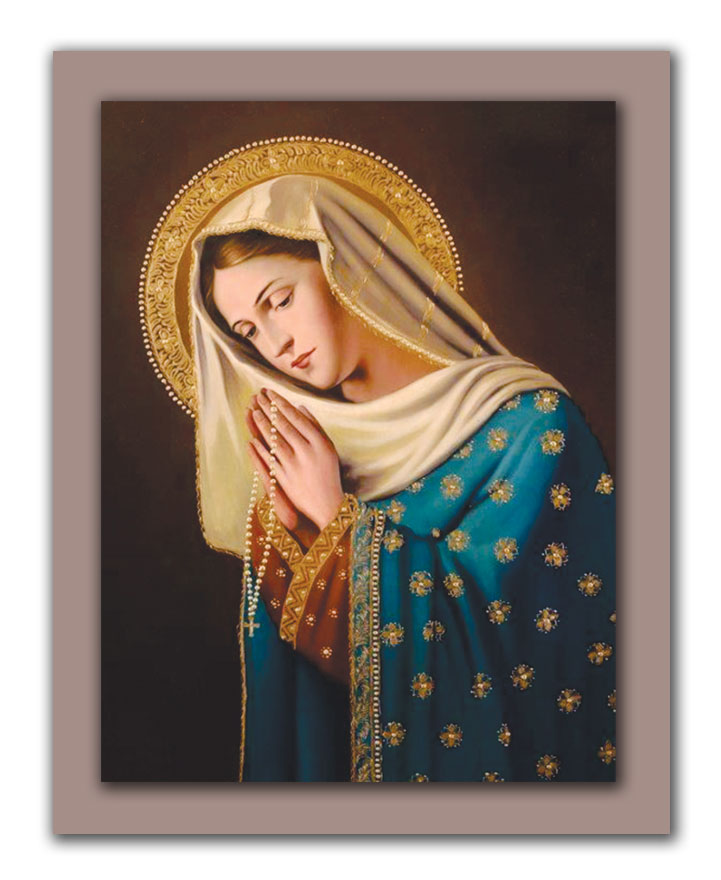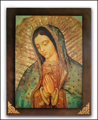 Madona en taracea (enchape) sobre tablones de madera y resinados.